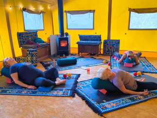 A Yin yoga class with Nix encouraging a gentle unfolding followed by a creative journaling session asking "What tiny buds of new life are beginning to appear from those winter dreams? What new beginnings are you experiencing?"